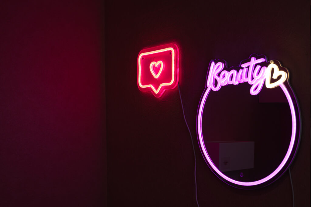 韓国カフェの定番アイテムのバルーンから、アーティスティックなネオンや絵画まで常設。小物にまでこだわったハイセンスな空間。